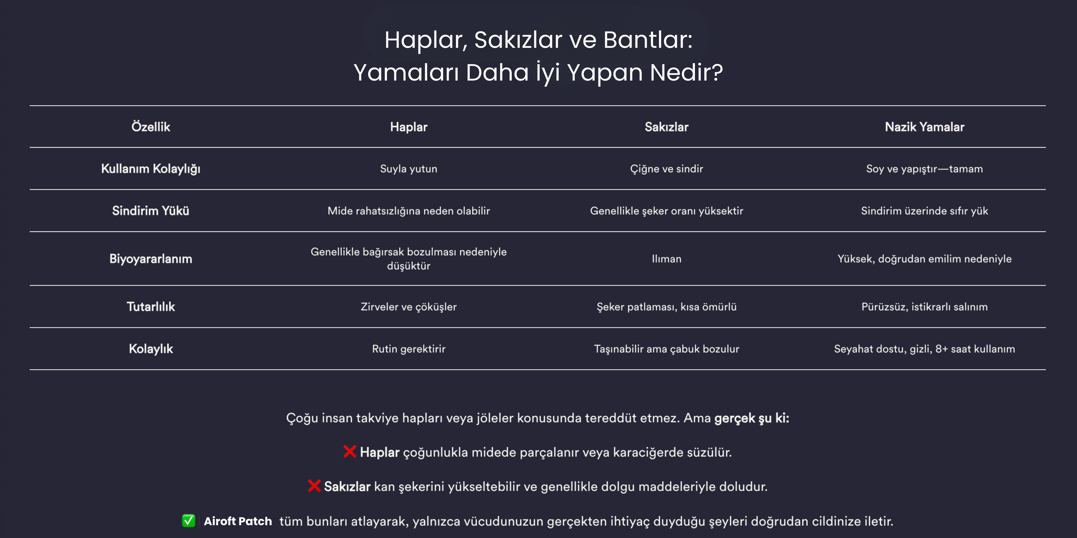 Her Airoft Patch, besinleri sindirimi tamamen atlayarak deri yoluyla kan dolaşımına iletmek için özenle tasarlanmıştır.